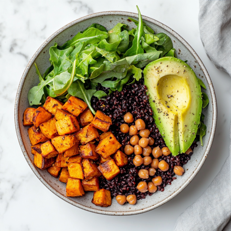The Sweet Potato and Black Rice Bowl is a hearty, nutrient-dense option packed with fiber, antioxidants, and complex carbohydrates. Sweet potatoes add natural sweetness and vitamin A, while black rice provides a rich source of anthocyanins, antioxidants, and protein. This combination makes the bowl both satisfying and wholesome.