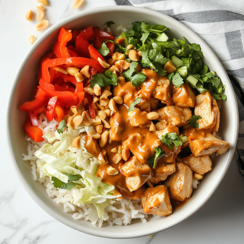 The Thai Peanut Chicken Rice Bowl is packed with bold flavors, balancing savory, sweet, and nutty notes. Peanut butter provides healthy fats and protein, while colorful vegetables deliver vitamins and fiber. This dish is perfect for those craving a restaurant-style meal at home.