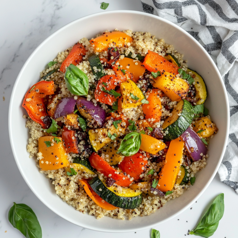 The Quinoa and Roasted Vegetable Rice Bowl is nutrient-packed and vegetarian-friendly. Quinoa is a complete protein, making it perfect for plant-based meals. Roasted vegetables enhance flavor, texture, and fiber content.